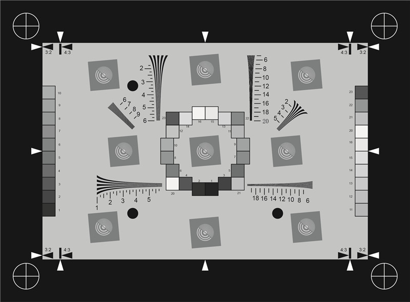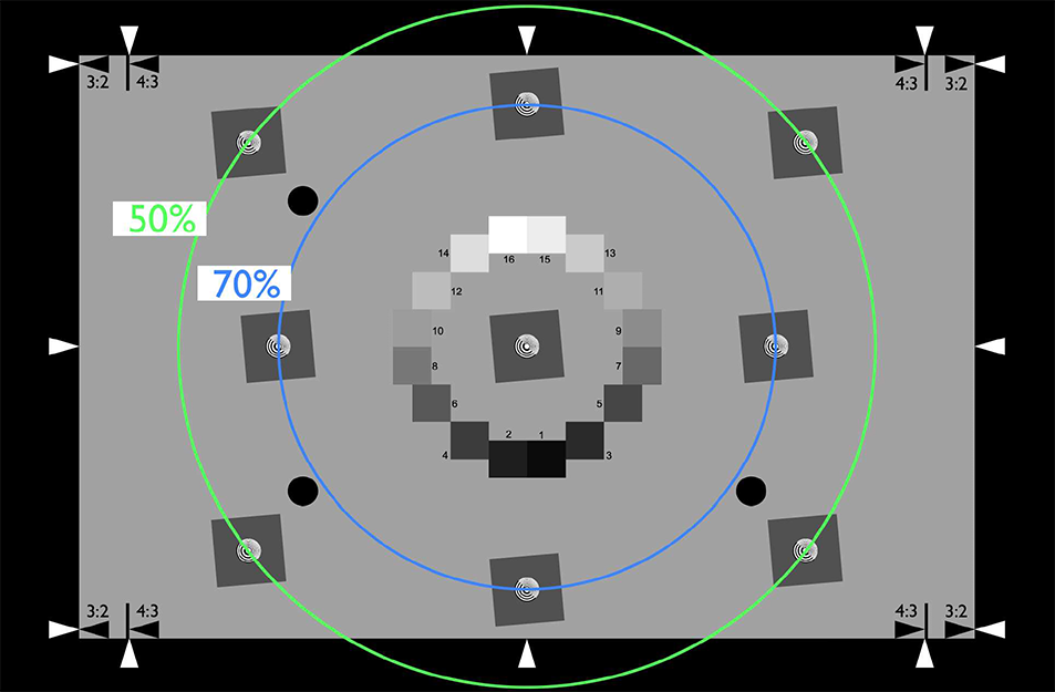 该图表包含九个倾斜边缘结构,每个结构有两个垂直边缘和两个水平边缘,中心有一个聚焦辅助。倾斜边缘为5°,具有斜边ISO12233:2014所要求的低对比度(调制度为0.55-0.65)。根据ISO12233:2014,背景提供了一种在0.15-0.25的缓和。倾斜边缘的布局是在传递轴信息,下图是50%场的位置及70%场的位置。
