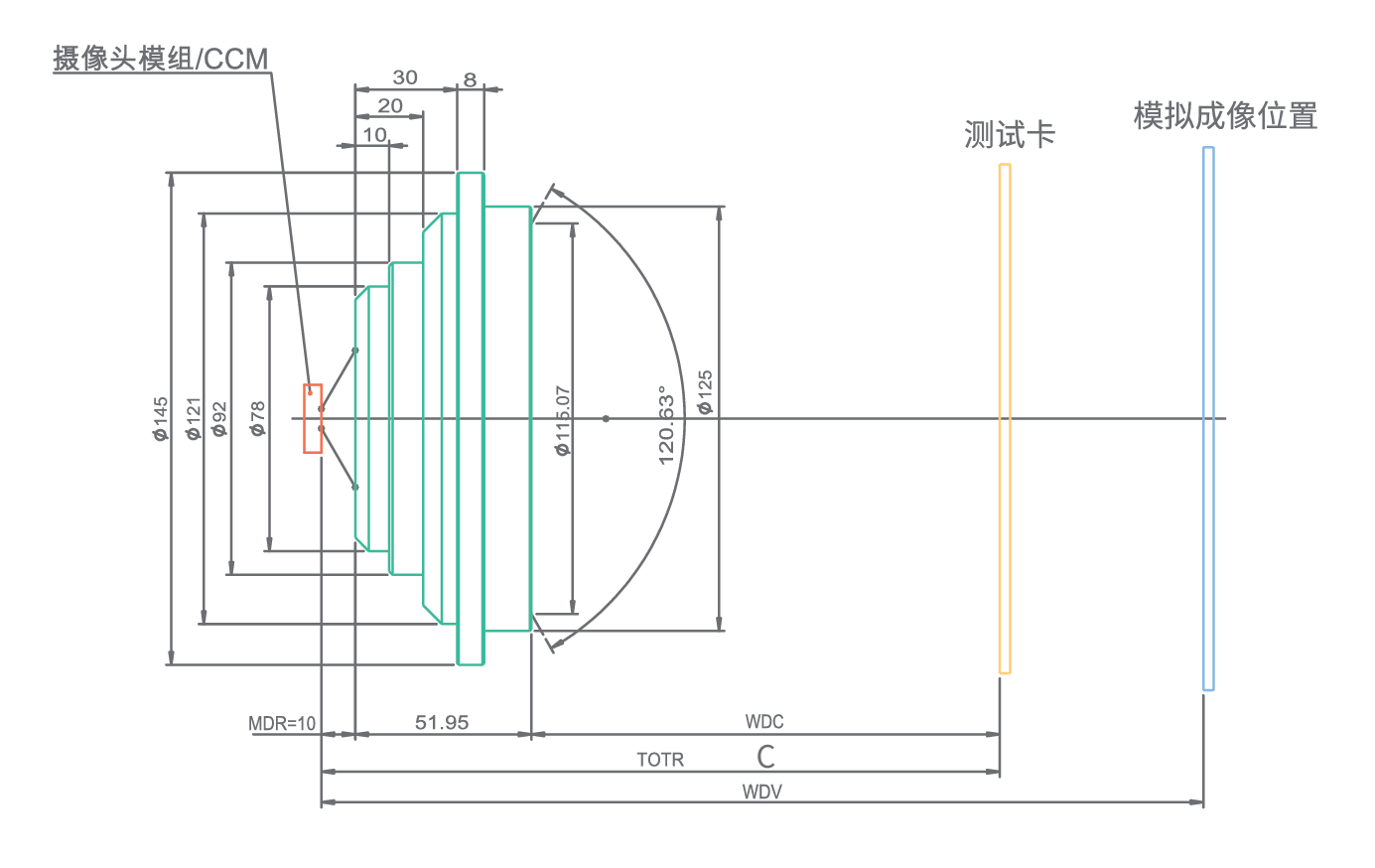 *MDR: 摄像头模组到中继镜相端的安装距离                   WDV: 摄像头模组到模拟成像位置的距离                 WDC: 中继镜物端到测试卡的距离