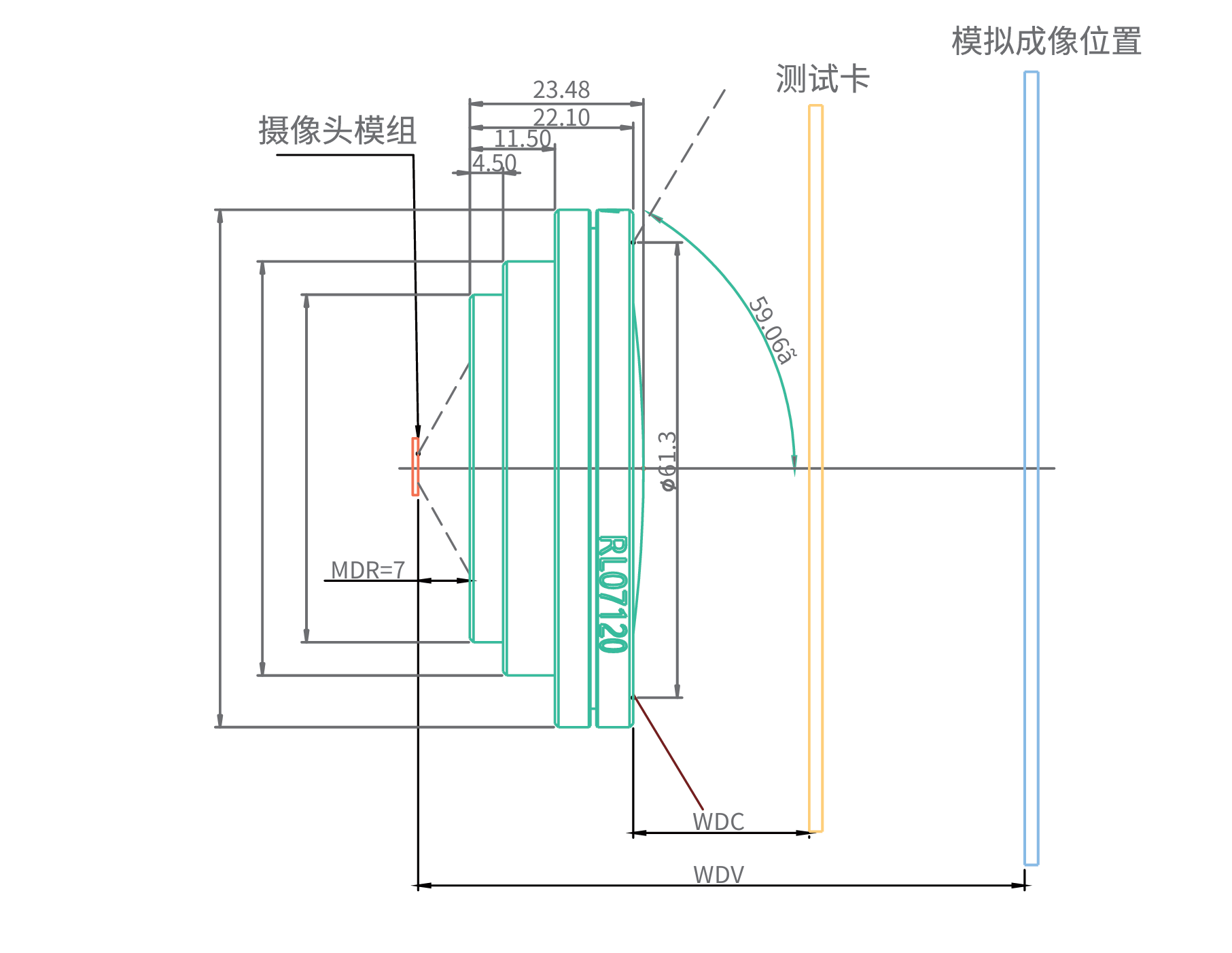 *MDR: 摄像头模组到中继镜相端的安装距离                   WDV: 摄像头模组到模拟成像位置的距离                 WDC: 中继镜物端到测试卡的距离