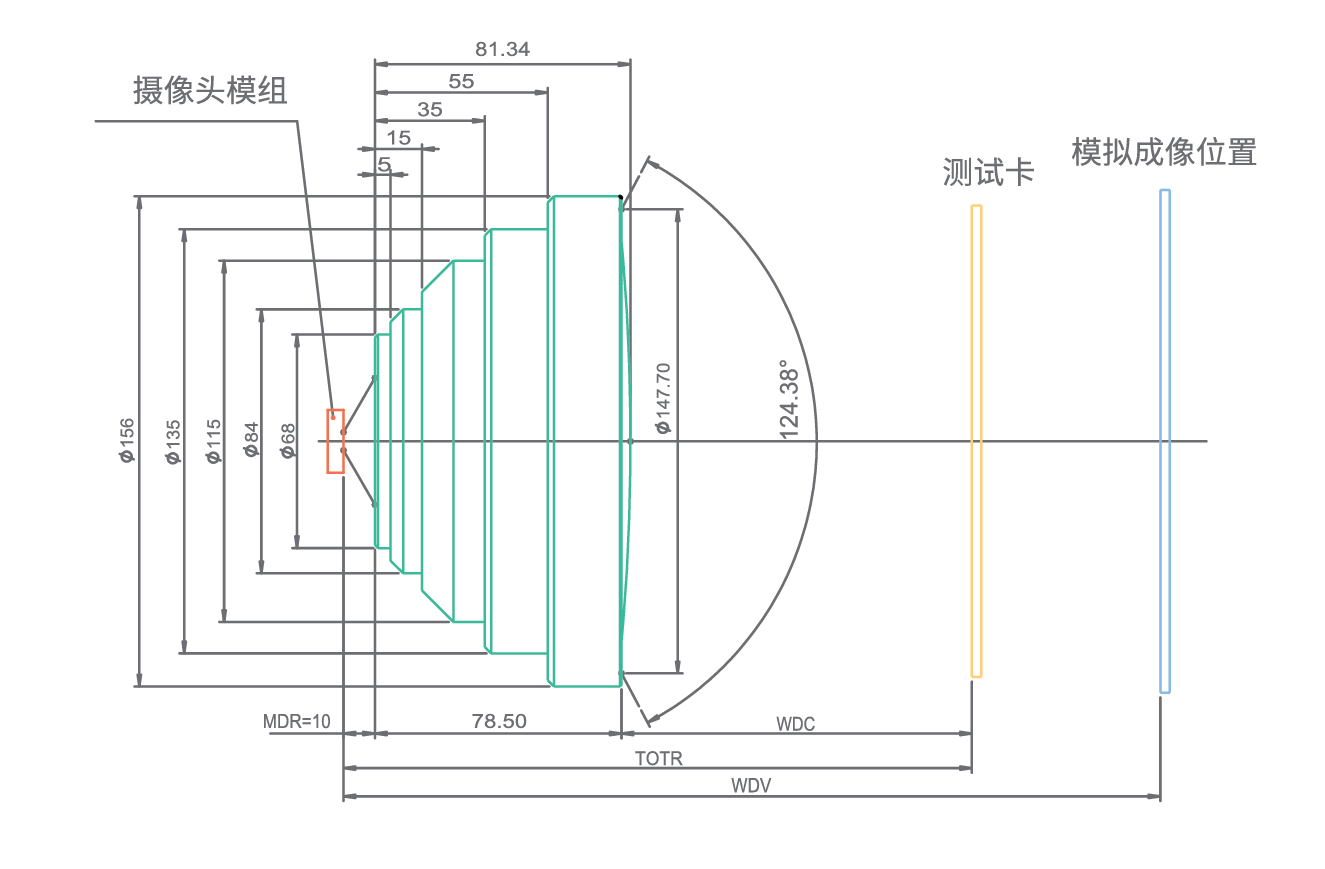 *MDR: 摄像头模组到中继镜相端的安装距离                   WDV: 摄像头模组到模拟成像位置的距离                 WDC: 中继镜物端到测试卡的距离