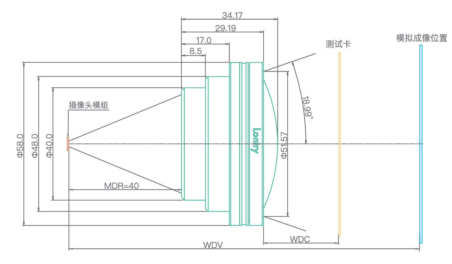 *MDR: 摄像头模组到中继镜相端的安装距离                   WDV: 摄像头模组到模拟成像位置的距离                 WDC: 中继镜物端到测试卡的距离